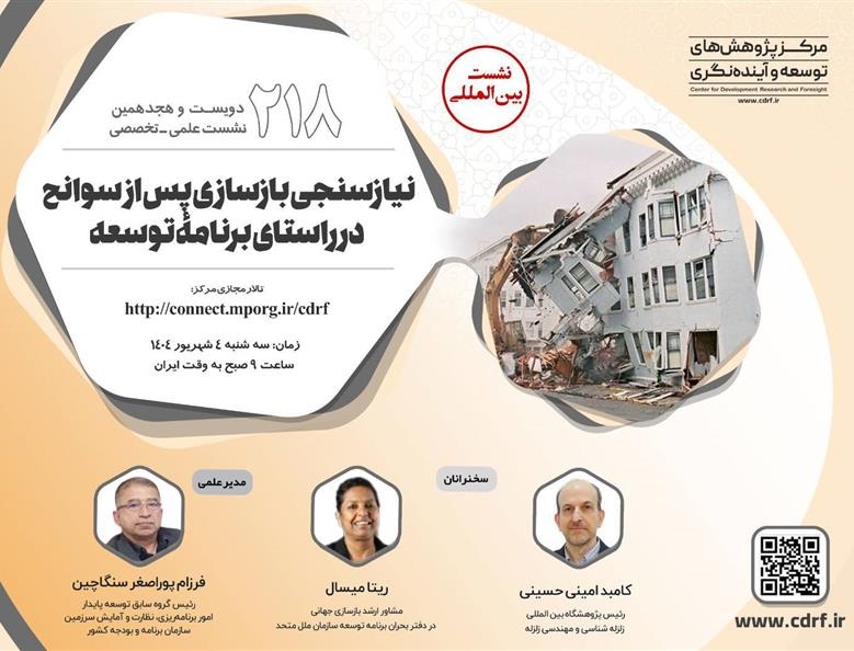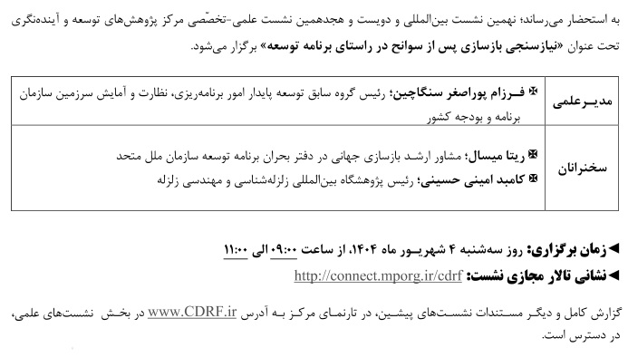 نشست علمی نیاز سنجی بازسازی سوانح در راستای برنامه توسعه ۰۳ شهریور ۱۴۰۴ | ۱۲:۳۷ کد : ۵۴۰۰۰ اطلاعیه ارسال به دیگران نام شما ایمیل شما ایمیل دریافتکننده ارسال انصراف تعداد بازدید:۱۵۷۹ نشست علمی نیاز سنجی بازسازی سوانح در راستای برنامه توسعه، توسط مرکز پژوهش های توسعه و آینده نگری برگزار می گردد.